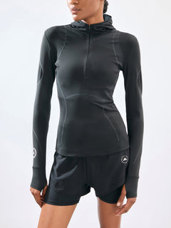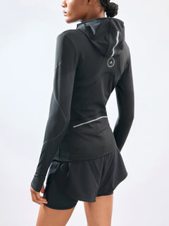 Brace the chill in style with the TruePace COLD.RDY full zip running longsleeve. Designed for a woman's run, this fitted hooded track top features thumbholes and an inside fleece fabric for extra warmth. The recycled elastane knit construction is not only sustainable but enables a tight fit that moves with you.
