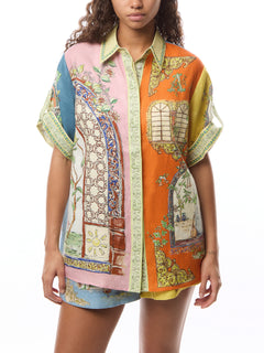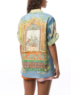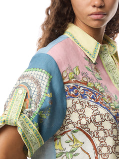 Relaxed shirt silhouette. Pointed collar and stand. Rolled sleeve hem with tabs. Concealed placket with self-covered buttons.