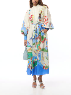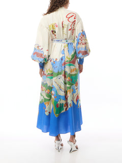 Artwork in collaboration with Nadia Hernandez. Straight mini dress silhouette.Point collar and stand. Sleeve with tucks and elasticated cuff. Concealed placket with shell buttons. In seam pockets , Skirt is lined, Self-tie belt.