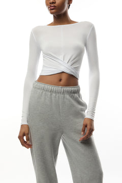 Prepare to walk the walk in the Cover Long Sleeve Top. The cropped slim fit silhouette, sweet front wrap detail and ribbed sleeves make it on-trend and on-point. Layer it over your favorite Alo bra for an easy, studio-to-street transition.