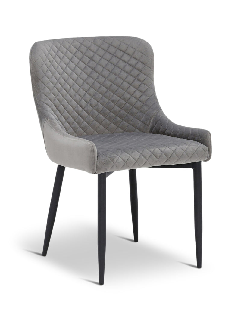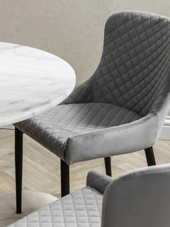 Effortlessly elegant, the Rivington grey velvet quilted dining chair adds a touch of understated luxury to any dining space. Upholstered in soft, slate-grey velvet, it offers a smooth, tactile finish with a subtle sheen. The quilted backrest introduces refined texture and tailored detail, while the generously padded seat ensures lasting comfort. Sleek metal legs provide a contemporary edge, perfectly balancing the chair's plush aesthetic with modern sophistication. Whether paired with a statement dining table or used as an accent piece, this chair combines comfort, style, and versatility for both everyday dining and special occasions.