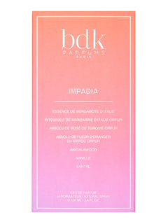 Impadia Eau de Parfum 100ml by BDK Parfums is a captivating women's fragrance that blends floral notes with the warmth of sandalwood. This elegant scent offers a balanced experience, combining fresh, delicate blooms with a rich, smooth base that lingers throughout the day. Perfect for those seeking a sophisticated and enduring perfume, Impadia provides a refined aromatic journey suitable for daily wear or special occasions.