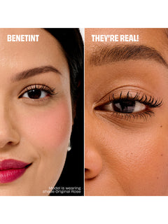 - Ingredient List: "Benetint: INGREDIENTS: AQUA (WATER), BUTYLENE GLYCOL, GLYCERIN, POLYSORBATE 20, SODIUM DEHYDROACETATE, HYDROXYACETOPHENONE, 1,2-HEXANEDIOL, CAPRYLYL GLYCOL, PARFUM (FRAGRANCE), SODIUM HYDROXIDE, TETRASODIUM EDTA, MALTODEXTRIN, CITRIC ACID, GERANIOL, CITRONELLOL, LINALOOL, HEXYL CINNAMAL. [+/- CI 75470 (CARMINE)]. They're Real Mascara: INGREDIENTS: AQUA (WATER), CERA ALBA (BEESWAX), PARAFFIN, STYRENE/ACRYLATES/AMMONIUM METHACRYLATE COPOLYMER, PROPANEDIOL, GLYCERYL STEARATE, POLYBUTENE, VP/EICOSENE COPOLYMER, STEARETH-21, COPERNICIA CERIFERA (CARNAUBA) WAX, PALMITIC ACID, STEARIC ACID, PHENOXYETHANOL, STEARETH-2, SILICA, AMINOMETHYL PROPANEDIOL, BUTYLENE GLYCOL, CAPRYLYL GLYCOL, SODIUM LAURETH-12 SULFATE, HYDROXYETHYLCELLULOSE, KAOLIN, ALUMINUM HYDROXIDE, TOCOPHERYL ACETATE, AMMONIUM HYDROXIDE, SERICIN, DISODIUM PHOSPHATE, SODIUM PHOSPHATE, POLYSORBATE 60, SODIUM HYALURONATE, CITRIC ACID, POTASSIUM SORBATE. [+/- CI 77499 (IRON OXIDES), CI 77007 (ULTRAMARINES)]. Disclaimer: PRODUCT INGREDIENT LISTINGS ARE UPDATED PERIODICALLY. BEFORE USING A BENEFIT PRODUCT, PLEASE READ THE INGREDIENT LIST ON THE PACKAGING OF YOUR PRODUCT TO BE SURE THAT THE INGREDIENTS ARE APPROPRIATE FOR YOUR PERSONAL USE. LES LISTES D'INGRÉDIENTS ENTRANT DANS LA COMPOSITION DES PRODUITS BENEFIT SONT RÉGULIÈREMENT MISES À JOUR. AVANT D'UTILISER UN PRODUIT BENEFIT, VEUILLEZ LIRE LA LISTE D'INGRÉDIENTS SITUÉE SUR SON EMBALLAGE AFIN DE VOUS ASSURER QUE LES INGRÉDIENTS SONT ADAPTÉS À VOTRE UTILISATION PERSONNELLE."