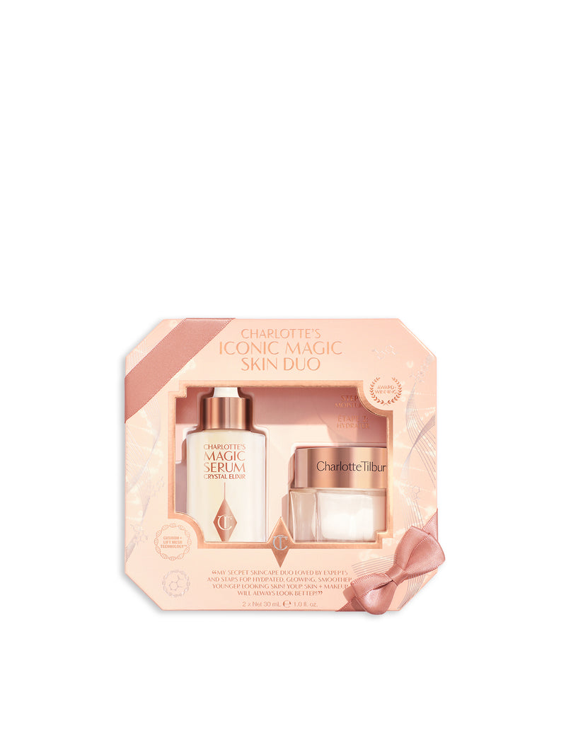 Discover the key to instant skin rejuvenation with the Iconic Magic Skin Duo. This set features Charlotte’s award-winning Magic Serum Crystal Elixir and the renowned Magic Cream, both celebrated by experts and celebrities for delivering hydrated, radiant, and smoother-looking skin. The Magic Serum Crystal Elixir (30ml) combines powerful ingredients like Replexium™, Golden™ Vitamin C, and Polyglutamic Acid to brighten, firm, and plump your skin with proven results. Charlotte’s Magic Cream (30ml) works as a moisturizer and primer, enriched with Cushion + Lift Mesh Technology™, Hyaluronic Acid, Vitamins C and E, and Peptides to enhance skin barrier strength and extend makeup wear. Give your skin the glow it deserves with this iconic duo.