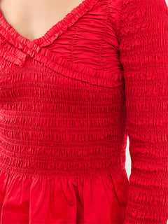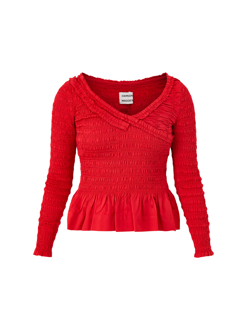The Suri Shirred Cotton Satin Blouse in Red by Damson Madder blends bold colour with textured finish. Soft cotton satin makes it comfortable yet striking. A blouse that elevates casual dressing.