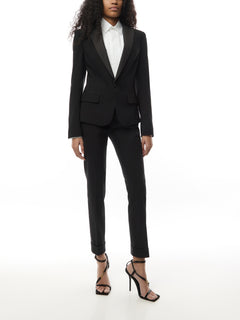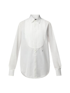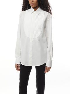 Embrace androgynous evening elegance in this chic cotton poplin tuxedo shirt, styled with a front plastron detail and D.C initials. Offset the masculine vibes with strappy high-heeled sandals for a chic party look.