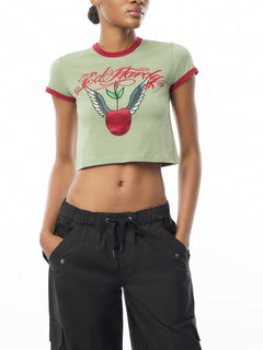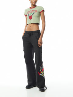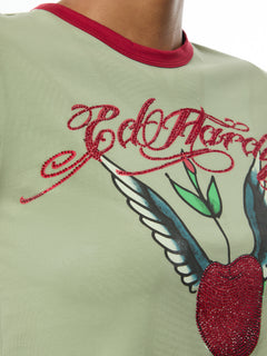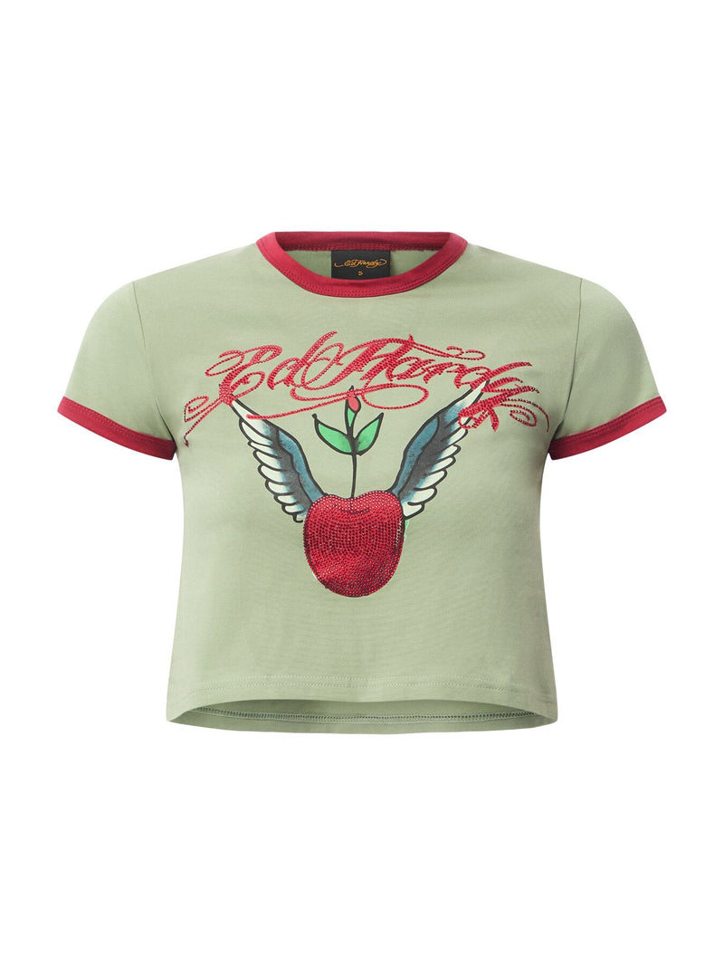 This cropped graphic t-shirt features a bold, full-color cherry tattoo graphic with layered shadow detailing, accented by a sparkling diamante logo. Contrast binding at the collar and sleeve cuffs adds an extra pop of color, while the reverse showcases Don Ed Hardy’s signature at the neckline.