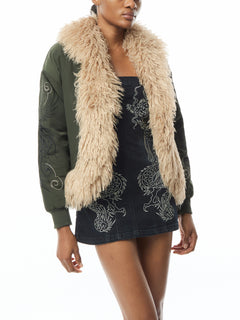 The Women's Death Rose Fur Jacket is a true Ed Hardy statement piece.Showcasing Ed's iconic Death Til Rose graphic in tonal embroidery to the back, paired with a super-luxe faux fur trim. This piece was designed for bold layering and includes welt front pockets, ribbed cuffs and ribbed hem to see you through every season.