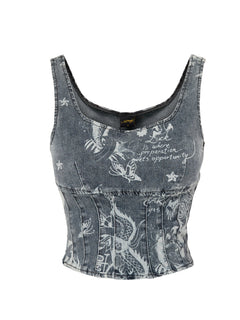 The Love Print Corset Top by Ed Hardy is designed in soft stretch cotton with a tattoo-inspired motif. With contour seams and a cropped cut, it offers nostalgic flair and a sculpted fit that revives early-2000s energy with contemporary confidence.