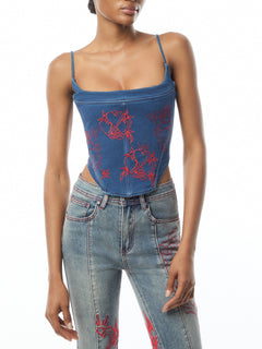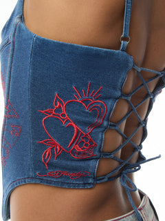 This indigo corset top features a striking red heart graphic that channels Ed Hardy’s bold tattoo artistry. Designed for a tight fit, it’s crafted from washed denim for a vintage feel. Adjustable straps and a lace-up back ensure a perfectly flattering fit that doesn’t compromise on style.