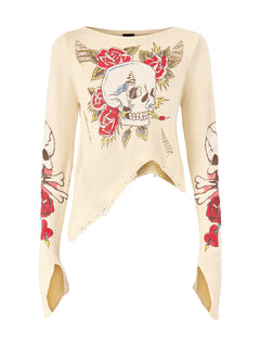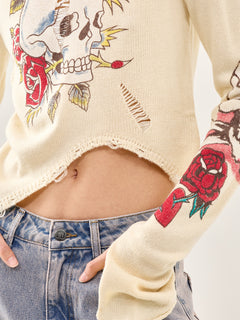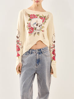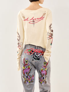 This Skull and Roses Distressed Knit by Ed Hardy is crafted with deliberate laddering and softened edges to create a lived-in, textured surface. A statement layer rooted in tattoo iconography for contemporary wardrobes.