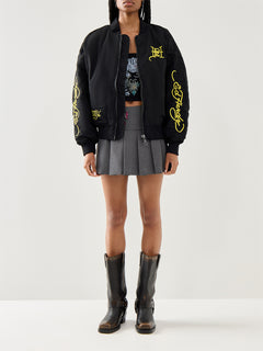 This women's pleated mini skort features a bold skull and panther design, combining edgy style with playful femininity. Its lightweight fabric and pleated silhouette offer comfort and ease of movement, making it a versatile piece for casual outings or statement looks. Perfect for those who want to add a unique touch to their wardrobe with a blend of attitude and charm.