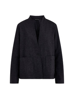 The High Collar Jacket by Eileen Fisher is crafted from structured wool blend in refined charcoal. With clean seaming and a sculptural neckline, it offers warmth and minimalist sophistication for transitional layering.