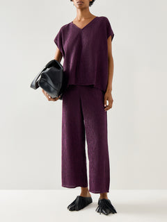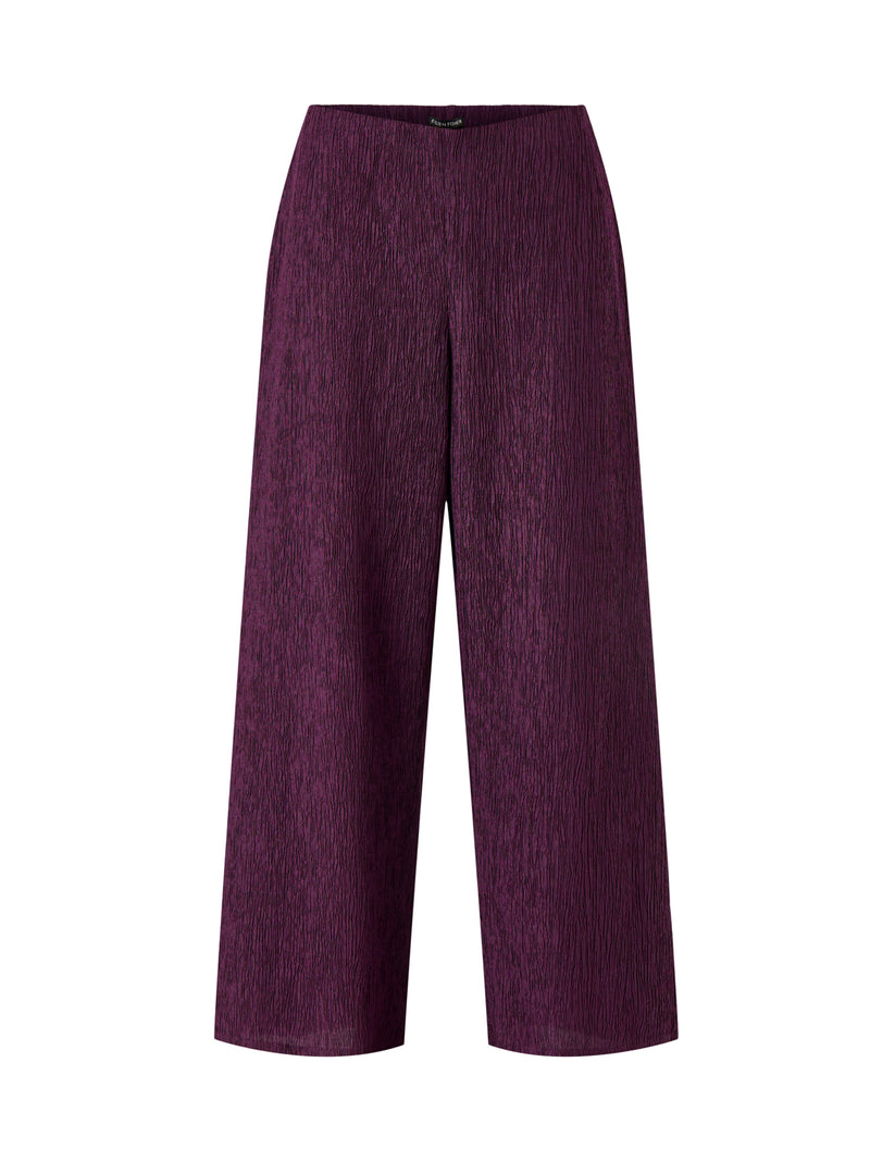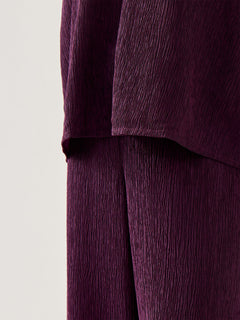 These high waist wide ankle pants feature a woven plissé fabric in a rich purple shade. Designed for comfort and style, their wide-leg cut and ankle length offer a flattering silhouette that moves gracefully. Ideal for both casual and dressier occasions, these pants combine a modern look with easy wearability.