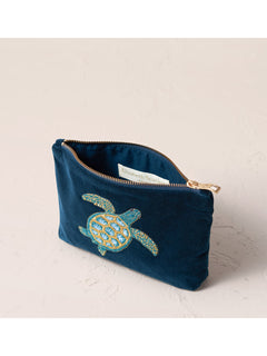 Swimming Turtle Velvet Mini Pouch Marine Navy