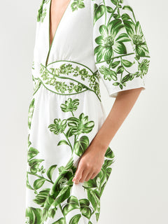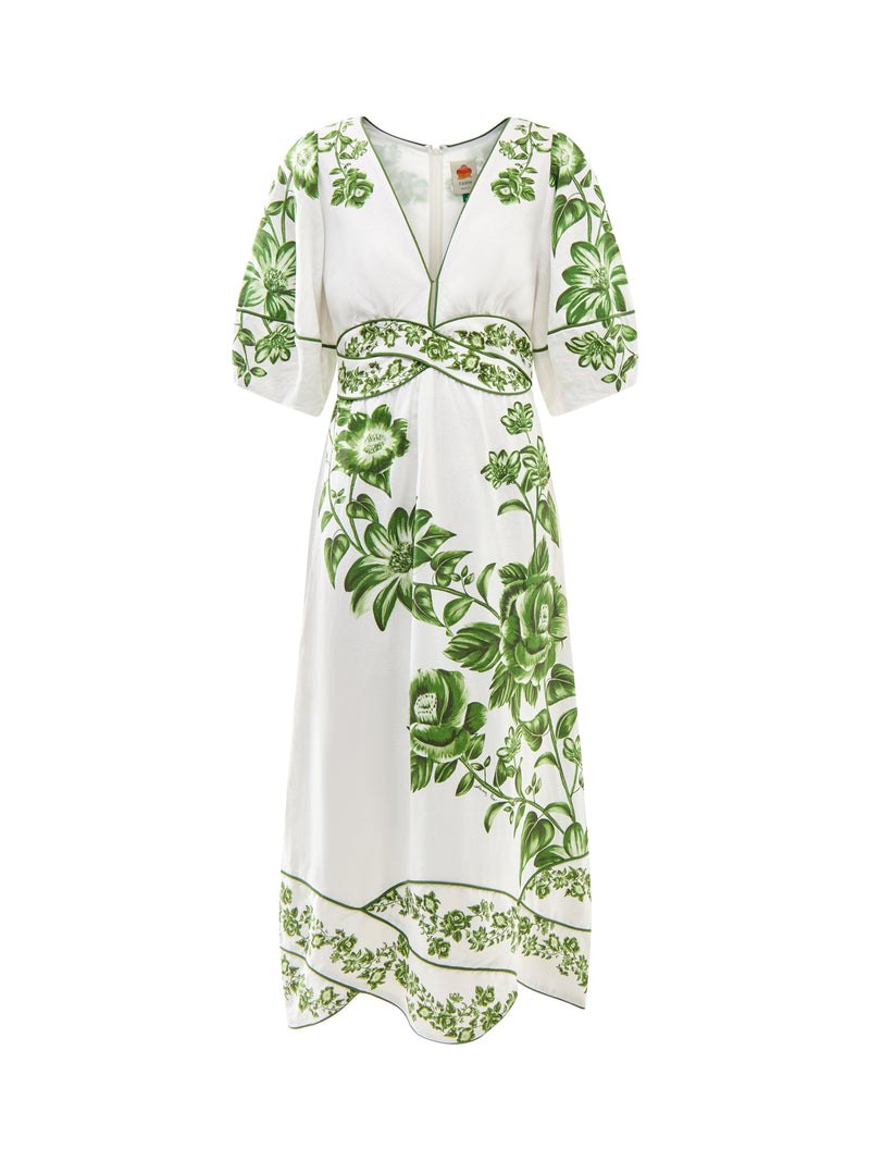 Green Floral Cascade Off-white Short Sleeve Midi Dress