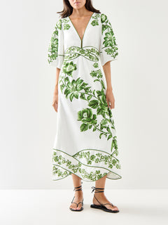 This off-white midi dress features a delicate green floral cascade design, adding a fresh and elegant touch to your wardrobe. With short sleeves and a flattering midi length, it offers both comfort and style for various occasions. Perfect for daytime events or casual outings, this dress combines classic charm with a modern floral pattern.