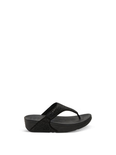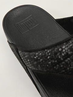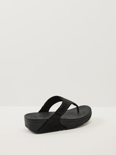 These Lulu Crinkled-Shimmer Toe-Post Sandals in black combine subtle shimmer with a crinkled texture for a stylish look. Designed with a toe-post style, they offer a comfortable fit ideal for warm weather. Their sleek black finish makes them versatile for both casual and dressier occasions.