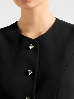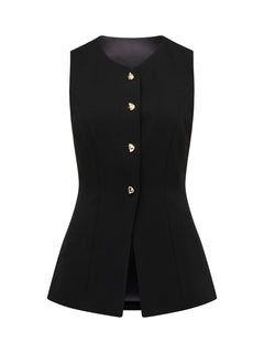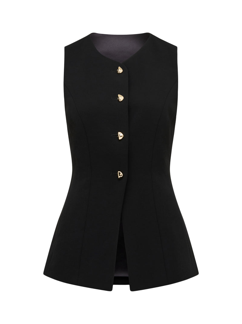 The Hendrix Long Waistcoat offers a tailored fit crafted from a smooth woven blend. It features a high neckline and sleeveless design, complemented by a button-through front with split gold-tone button detailing. Vertical seams enhance its structured silhouette, making it a sophisticated addition to any wardrobe.
