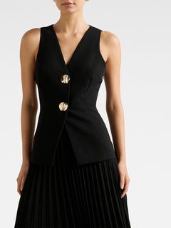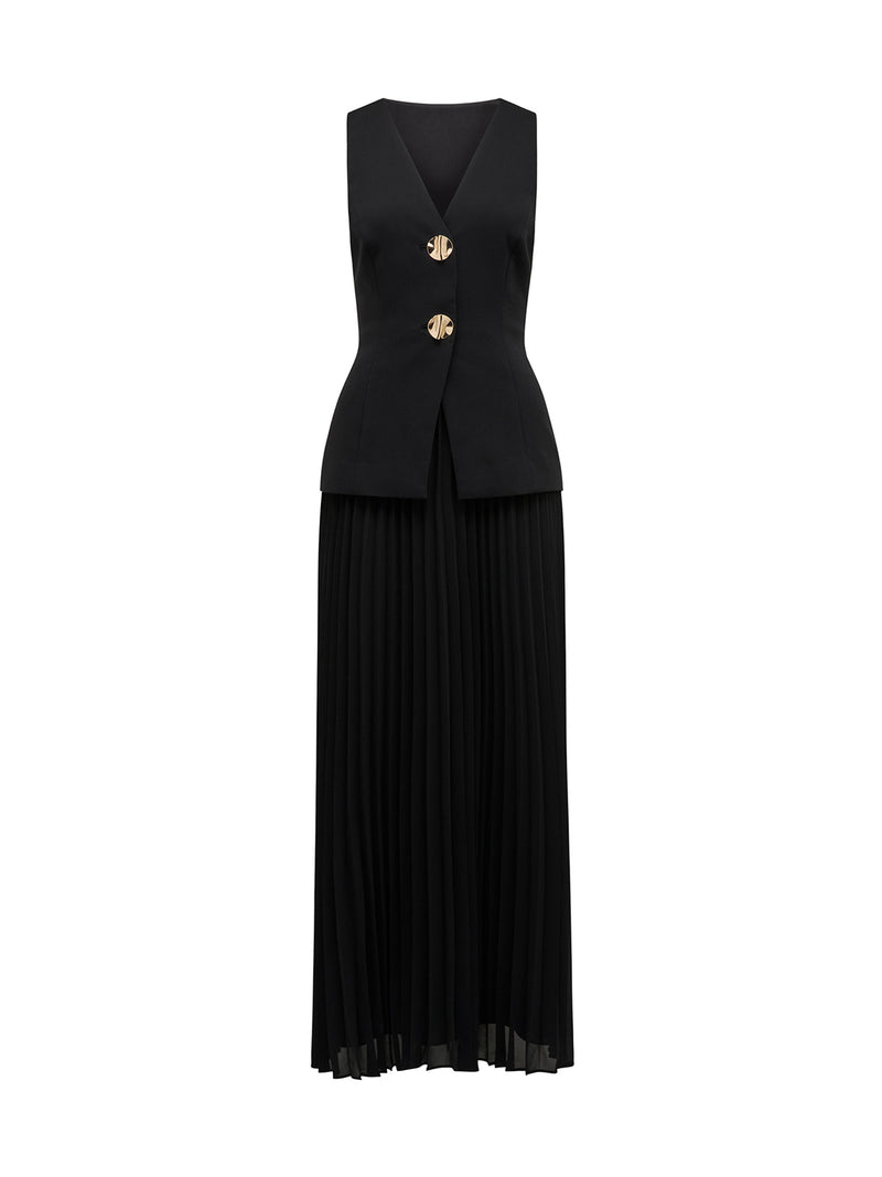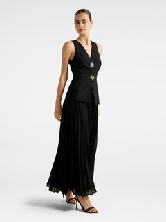 The Larissa Maxi Dress by Forever New features delicate pleating through the skirt for graceful movement. Crafted in classic black, it’s designed for elegant evenings or formal occasions with effortless impact.