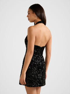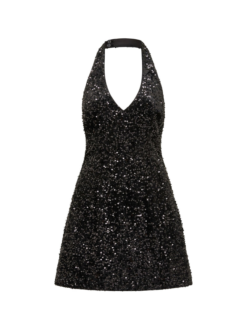The Riley Sequin Halter Neck Mini Dress by Forever New introduces tonal sequin texture across a sculpted mini length. A modern statement defined by proportion and clarity.