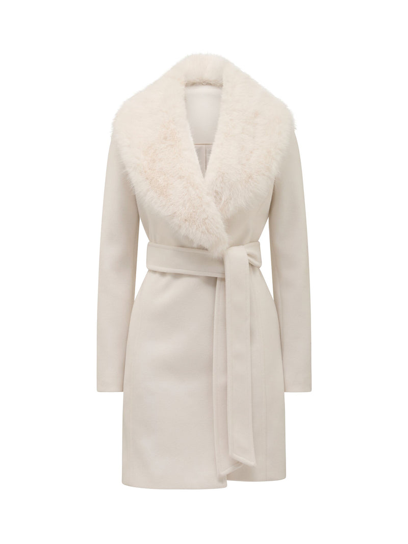 The Rocky Faux Fur Collar Wrap Longline Coat Cream by Forever New delivers statement winter glamour. With a plush faux fur collar, wrap-front design and elongating silhouette, it brings warmth and elegance in equal measure. Wear over knitwear or eveningwear for a refined finish.