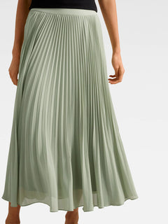 The Aurora Pleated Skirt features a classic pleated design and a flattering midi length. Its elegant silhouette offers both movement and style, making it a versatile piece suitable for a variety of occasions.