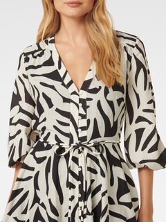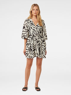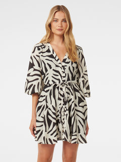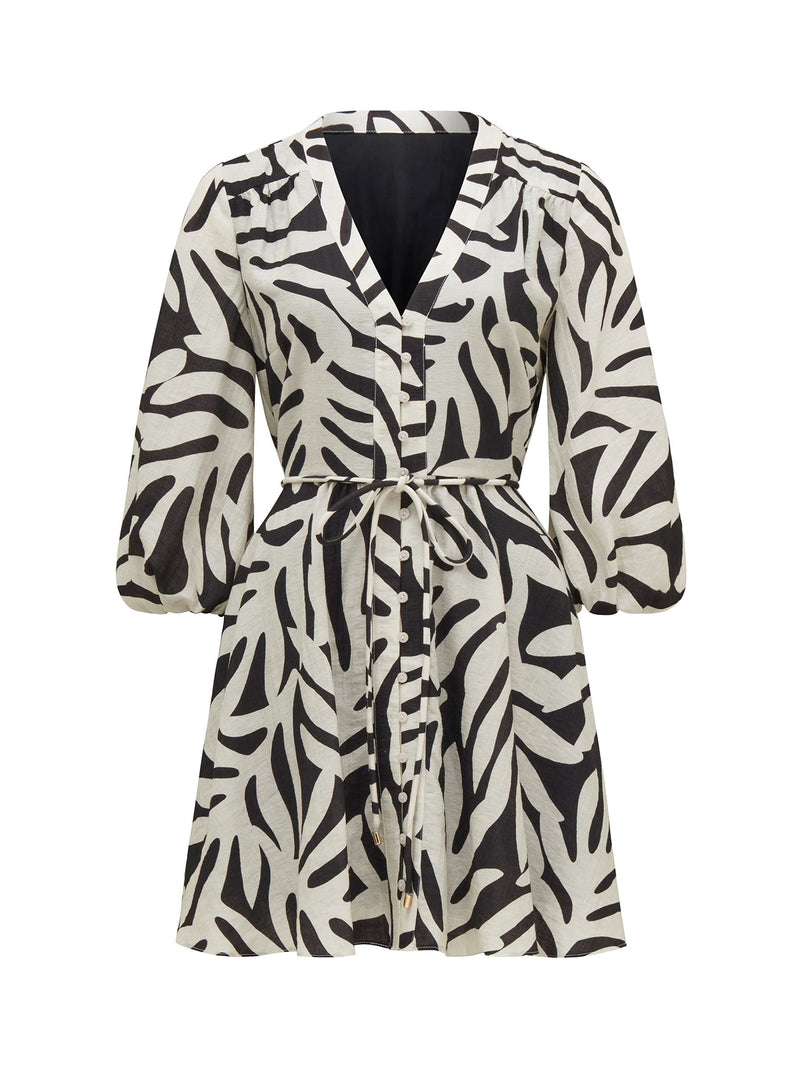 The Alicia Rope Tie Mini Dress by Forever New is cut from soft fabric printed with a tropical green leaf motif. Designed with a rope tie belt and flowing hem, it captures relaxed summer elegance.