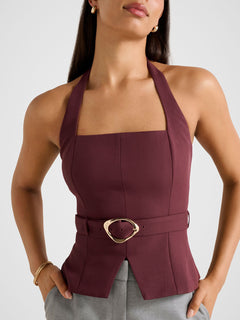 The Ellisa Belted Hardware Long Sleeve Top Red by Forever New blends structure with feminine refinement. Its hardware belt creates a flattering silhouette while the sleek neckline adds polish. Style with tailored trousers for a chic day-to-evening look.