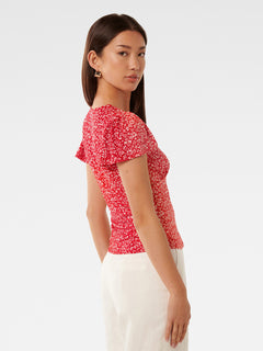 The Lulu Printed Flutter Sleeves Top by Forever New combines comfort and style with its lightweight polyester fabric and regular fit. Featuring delicate printed flutter sleeves, this top adds a feminine touch to casual or dressy outfits. Ideal for warm days, it offers breathable wear while maintaining an elegant silhouette perfect for various occasions.