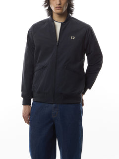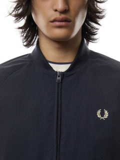 This bomber style overlayer is made from heavy-weight, high-slub Taslan fabric (that means tightly woven fibres that keep the warmth in and the wind and damp out).