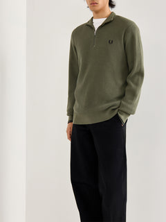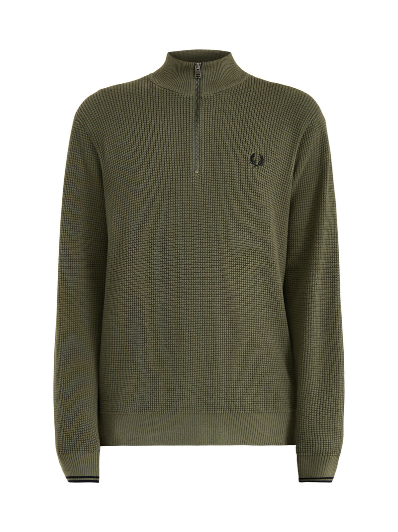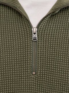 This green waffle stitch half zip jumper combines classic style with practical comfort. Its textured knit offers warmth and breathability, while the half zip design allows for easy layering and adjustable ventilation.