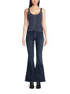 Effortlessly cool and so multi-purpose, this denim vest is featured in a slim-fitting silhouette and hip-length style with a scoop neckline and button-front closures.