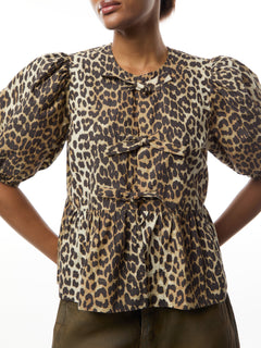 This Leopard Cotton Poplin Peplum Tie Blouse incorporates an open round neckline with tie bands, puff sleeves with elastic edges and a peplum hem.