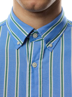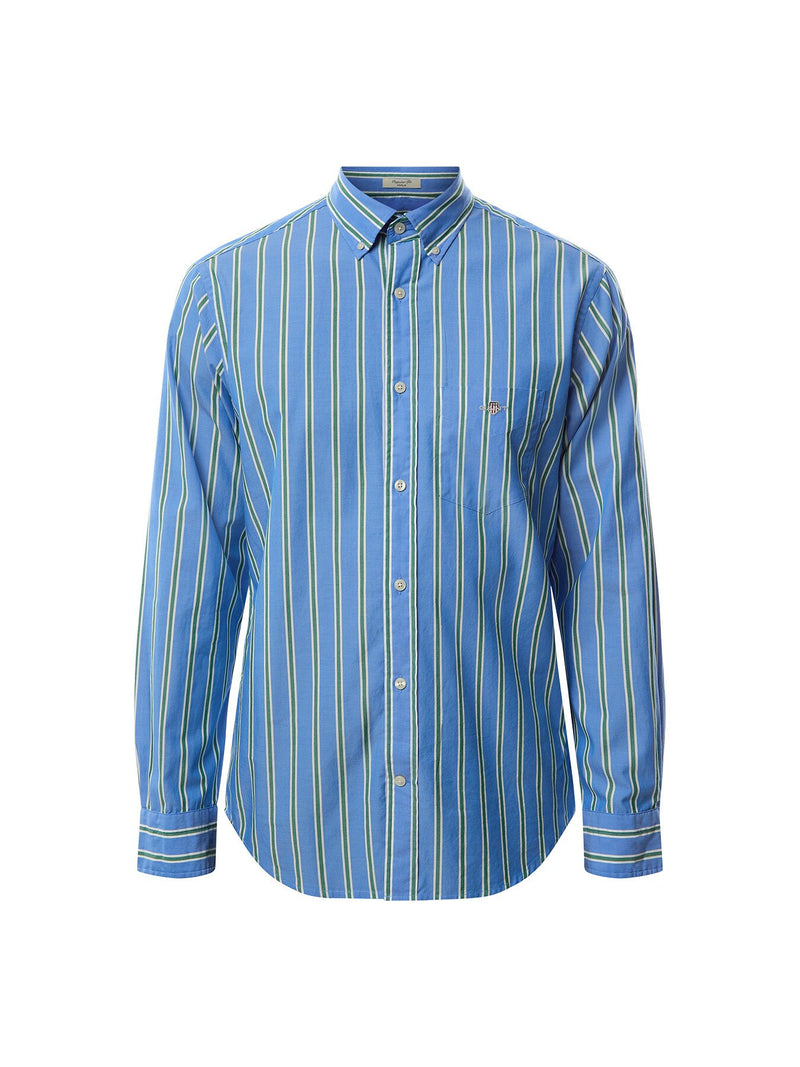 Crafted in a classic poplin fabrication, this shirt is designed with a regular fit and features a yarn-dyed striped pattern. It is designed with a button-down collar, a shield graphic embroidered at the chest pocket, recycled polyester buttons and a box pleat with our signature locker loop at the back.
