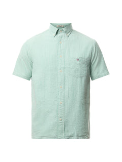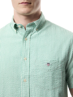 Elevate your style with the Regular Fit Striped Seersucker Short Sleeve Shirt. The woven stripes add a touch of sophistication, while the regular fit and classic button-down collar provide a comfortable, timeless look. Featuring a GANT shield graphic, curved hem, and signature locker loop for added details.