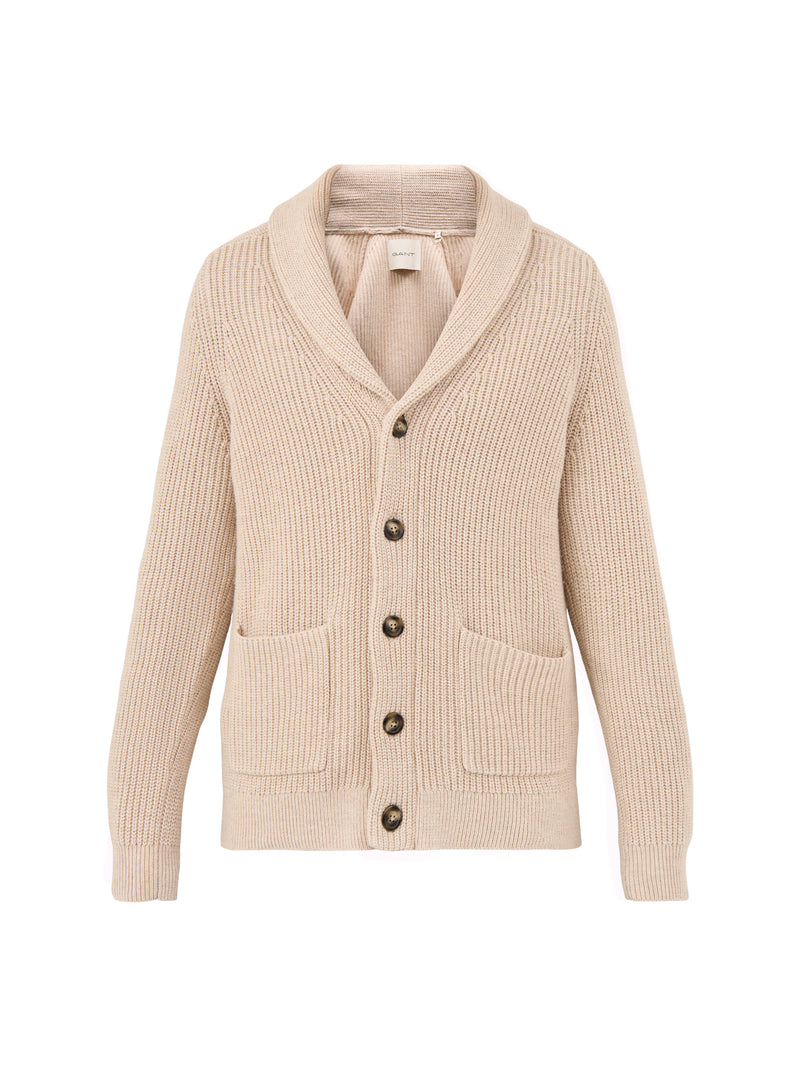 The Wool-Blend Shawl Collar Cardigan by GANT is knitted from a warm wool blend with a soft handle and ribbed trims. Designed with a shawl neckline and button front, this cardigan delivers an elevated alternative to casual knitwear. The textured beige melange tone complements denim or tailored trousers, making it a versatile mid-layer through the colder months.