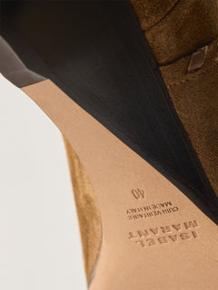 The Edoa Boot by Isabel Marant is crafted in supple bronze suede with whip-stitch detailing. A sculpted silhouette and subtle heel lend bohemian refinement — true to the brand’s free-spirited, luxurious aesthetic.