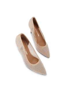 The ANGEL shoe features a delicate mesh fabric adorned with iridescent crystals, creating a shimmering and eye-catching effect. It is finished with a camel patent heel, adding a sleek and polished contrast. This design blends elegance with subtle sparkle, perfect for special occasions.