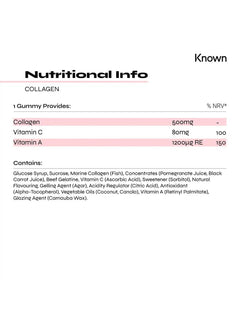 - Ingredient List: Glucose Syrup, Sucrose, Marine Collagen (fish), Concentrates (pomegranate Juice, Black Carrot Juice), Beef Gelatine, Vitamin C, Sweetener (sorbitol), Natural Flavouring, Gelling Agent (agar), Acidity Regulator (citric Acid), Antioxidant (alpha-tocopherol)