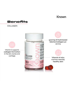 Indulge in the revitalising power of Known Nutrition’s Pomegranate Flavoured Collagen Gummies. Each serving delivers 500mg of Hydrolysed Marine Collagen, designed to support the health and appearance of your hair, skin, and nails.
