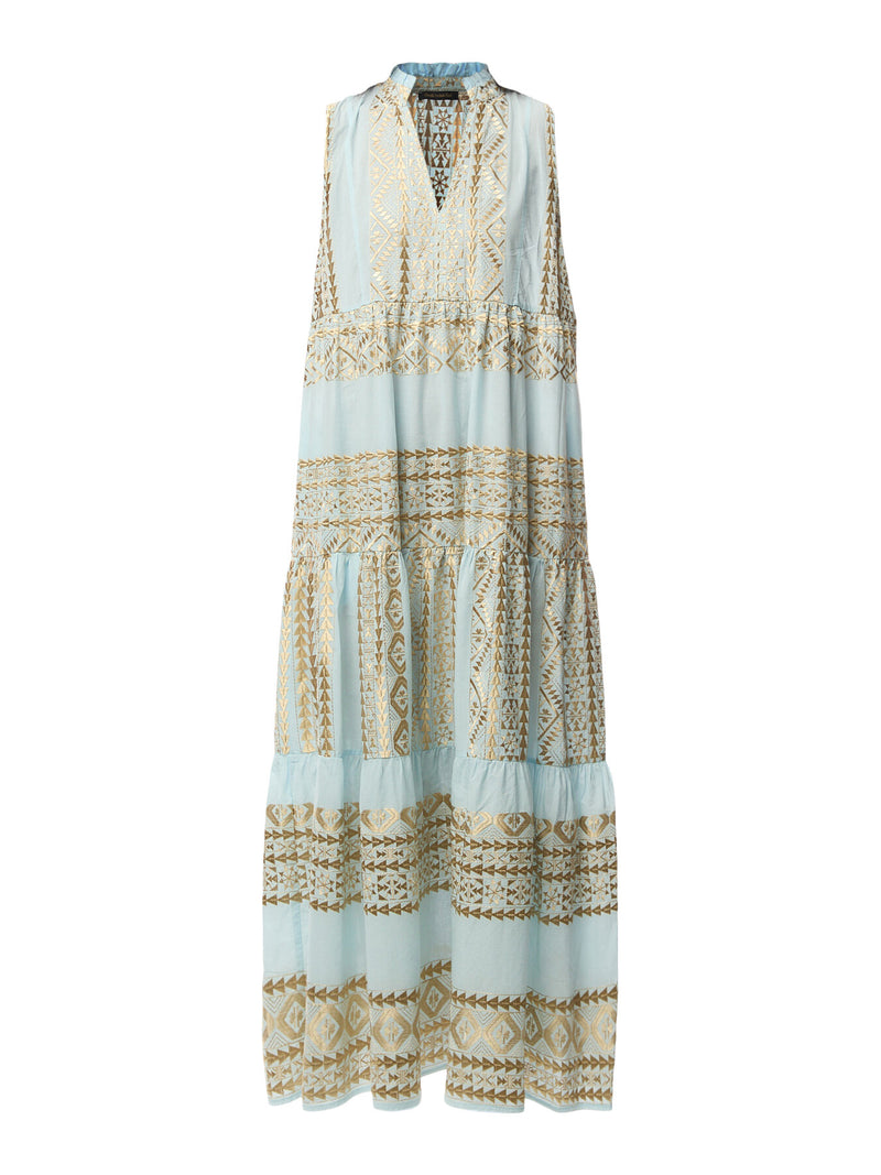 This sundress with intricate gold embroidery and front button detail by Kori is a summer classic with timeless appeal.