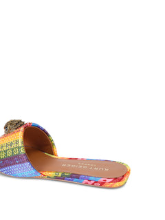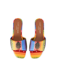 The Kensington Flat Sandal by Kurt Geiger showcases a striped satin printed fabric that offers a chic and contemporary look. The strap is detailed with an antiqued brass eagle head embellished with crystals and crystal eyes, adding a touch of refined elegance. This sandal combines distinctive design elements with comfortable wear, making it a stylish choice for everyday sophistication.