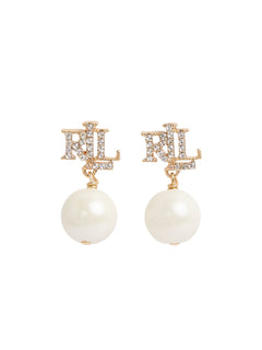 Lauren Ralph Lauren Gold Crystal Logo Pearl Drop Earrings
