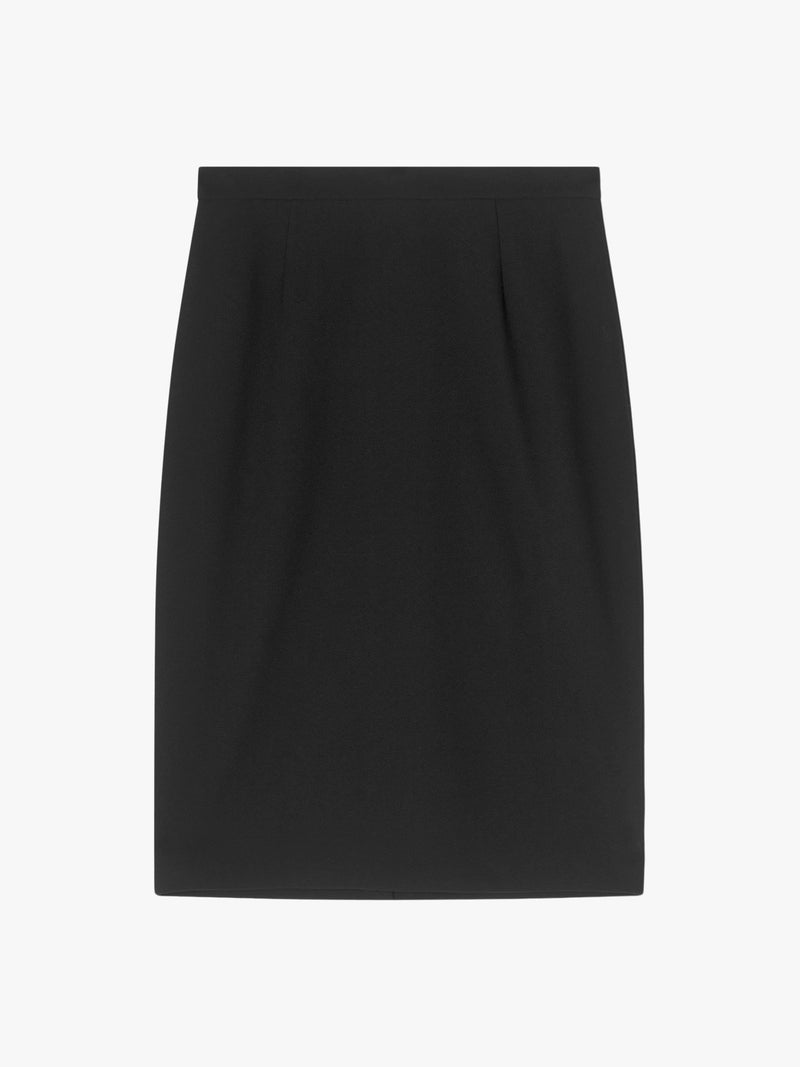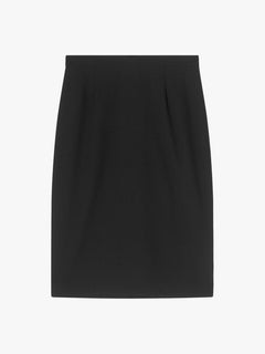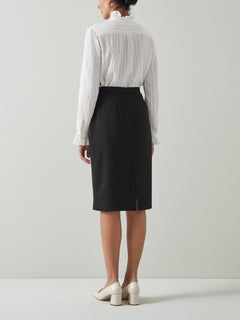 The Nina pencil skirt is crafted from a lightweight black fabric. It sits high on the waist, has a fitted shape, falls to the knee and has a back slit.