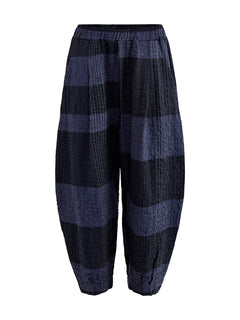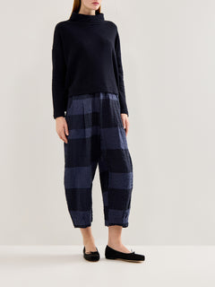 The Check Barrel Leg Trousers by Mama B feature a sculpted leg and elasticated waistband. Cut in a textured check fabric, they balance ease and modern tailoring.