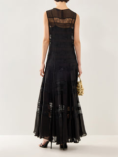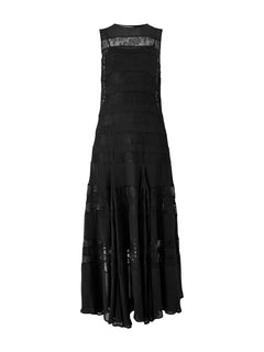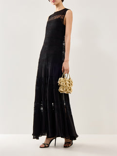 The Gessy Maxi Dress by Marella is crafted from flowing fabric with intricate lace inserts across the bodice and sleeves. The floor-length silhouette moves with effortless grace, reflecting the label’s Italian craftsmanship and feminine ease.