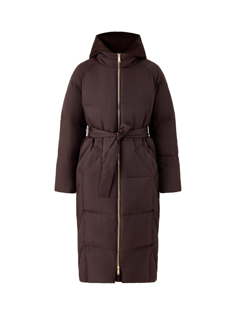 This Sport Yole Long Maxi Puffer in brown features a full-length design with a hood and a belt for a secure, adjustable fit. Its insulated construction provides warmth and comfort, making it ideal for cold weather. The hood adds extra protection against wind and rain, while the belt enhances shape and style.