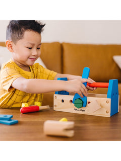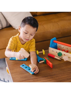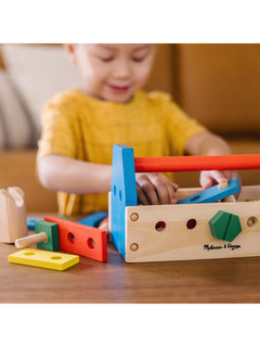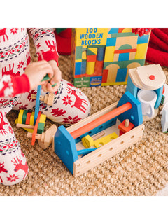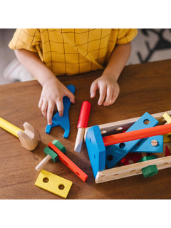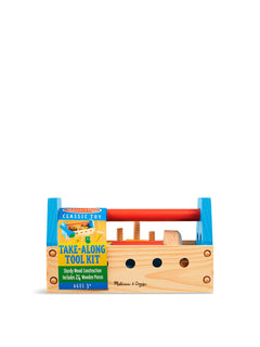 This Melissa & Doug toolkit is a great way to help build imaginations! You can give little builders the tools they need for truly constructive play with this sturdy wooden Take-Along Tool Kit. The set is made from high-quality wood painted in bright, bold colors, and includes 24 pieces sized just right for little hands. The play toolbox comes with wooden nails, screws, nuts, and bolts, plus a toy hammer, wrench, and screwdriver.