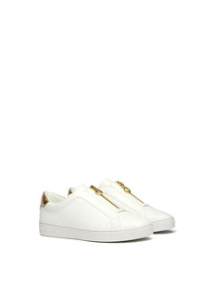 The Keaton Slip-On Trainers by Michael Kors are crafted from smooth white leather with subtle logo detailing. A flexible rubber sole and elastic inserts offer easy wear and refined simplicity.
